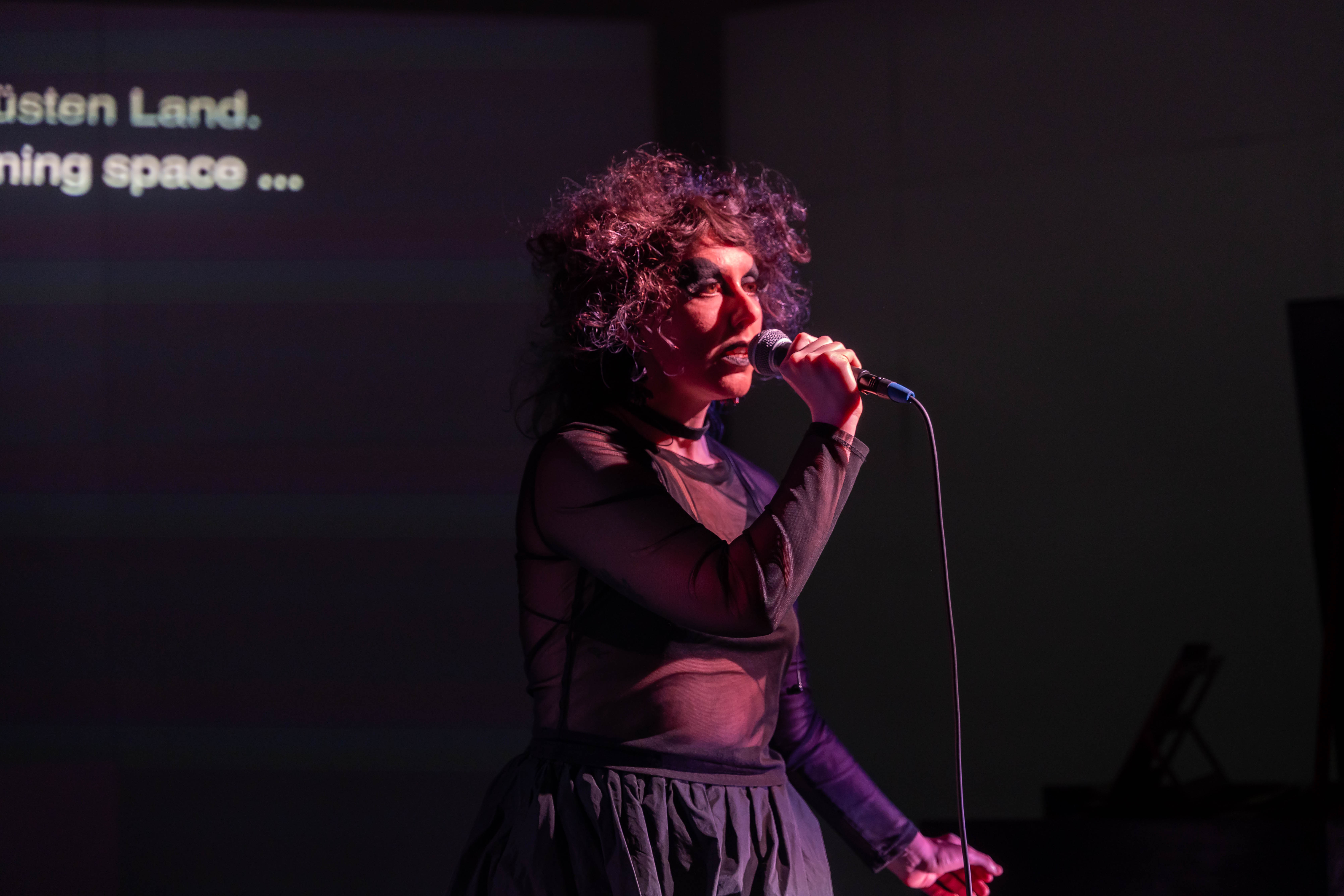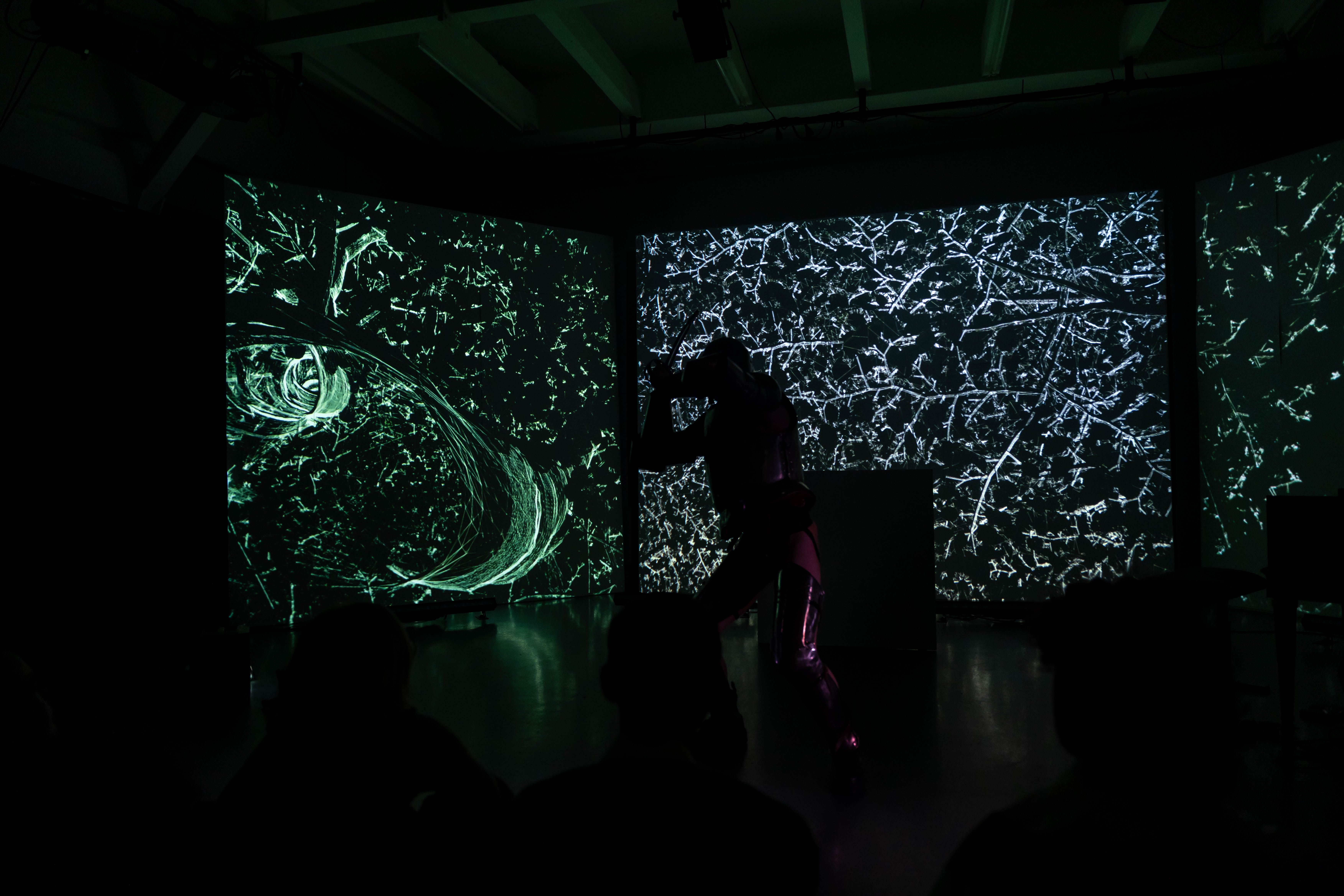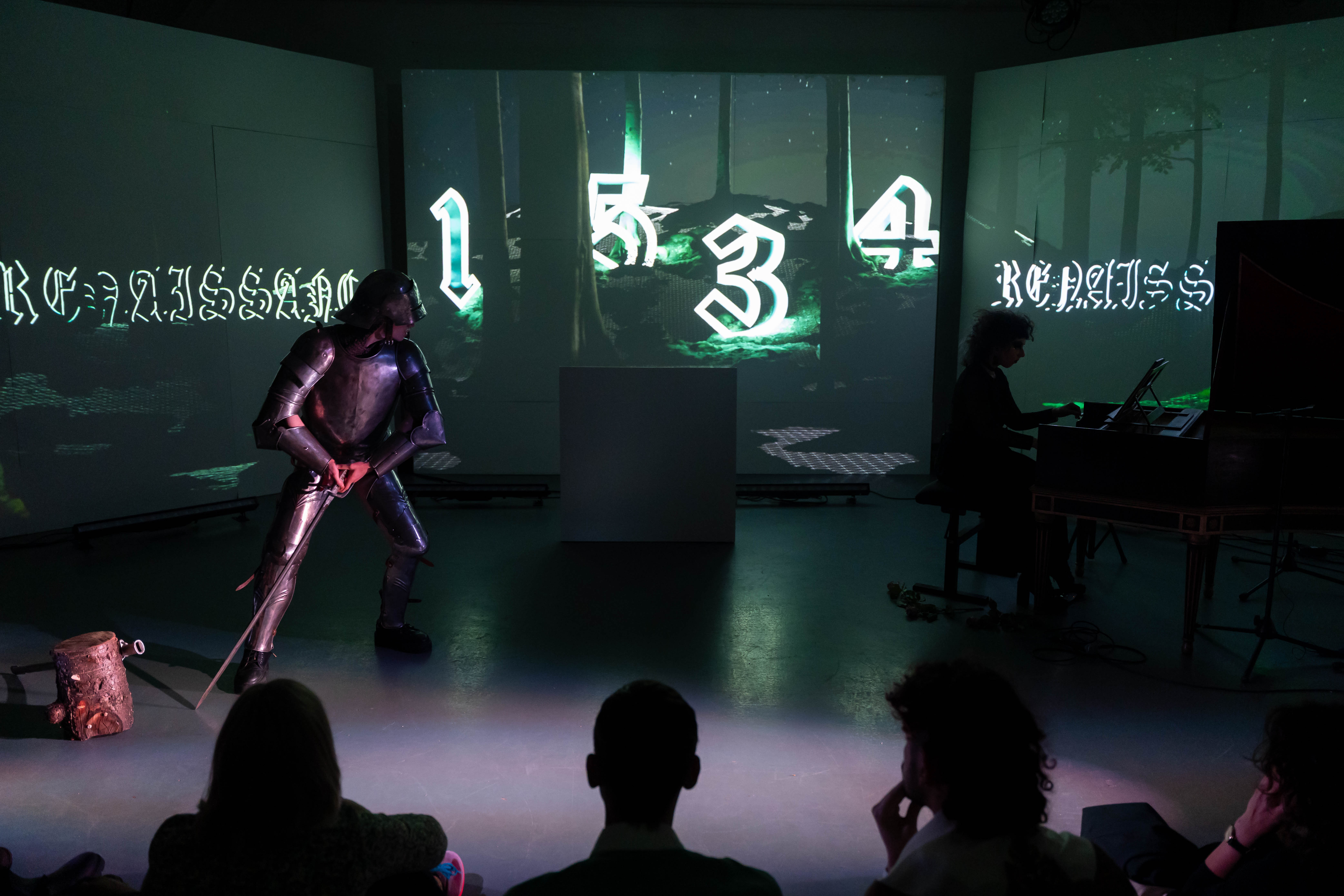 „A Peculiar State“ ist eine immersive Multimedia-Konzert-Performance, bei der das Publikum auf einer postdigitalen Waldlichtung einem Ritter begegnet, der über die seltsame Realität unserer Zeit sinniert. Das Publikum nimmt auf der Bühne, am virtuellen Lagerfeuer des Ritters, Platz. Von dort aus entfaltet sich eine hybride, halb virtuelle, halb reale Welt, die sich von einem digitalen Märchenwald in ein postdigitales Wasteland verwandelt, das an eine Simulation der Welt nach der Klimakatastrophe erinnert.