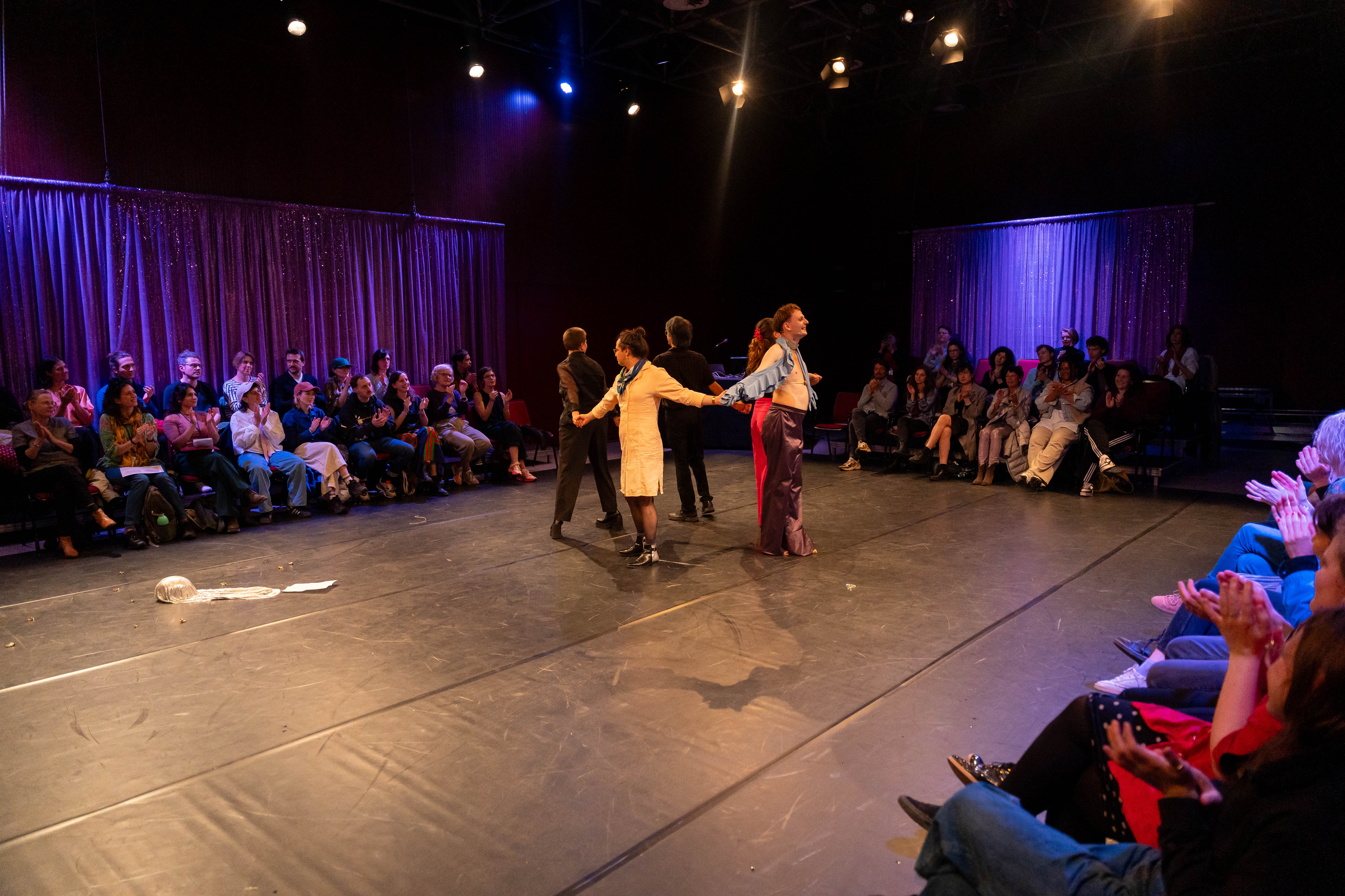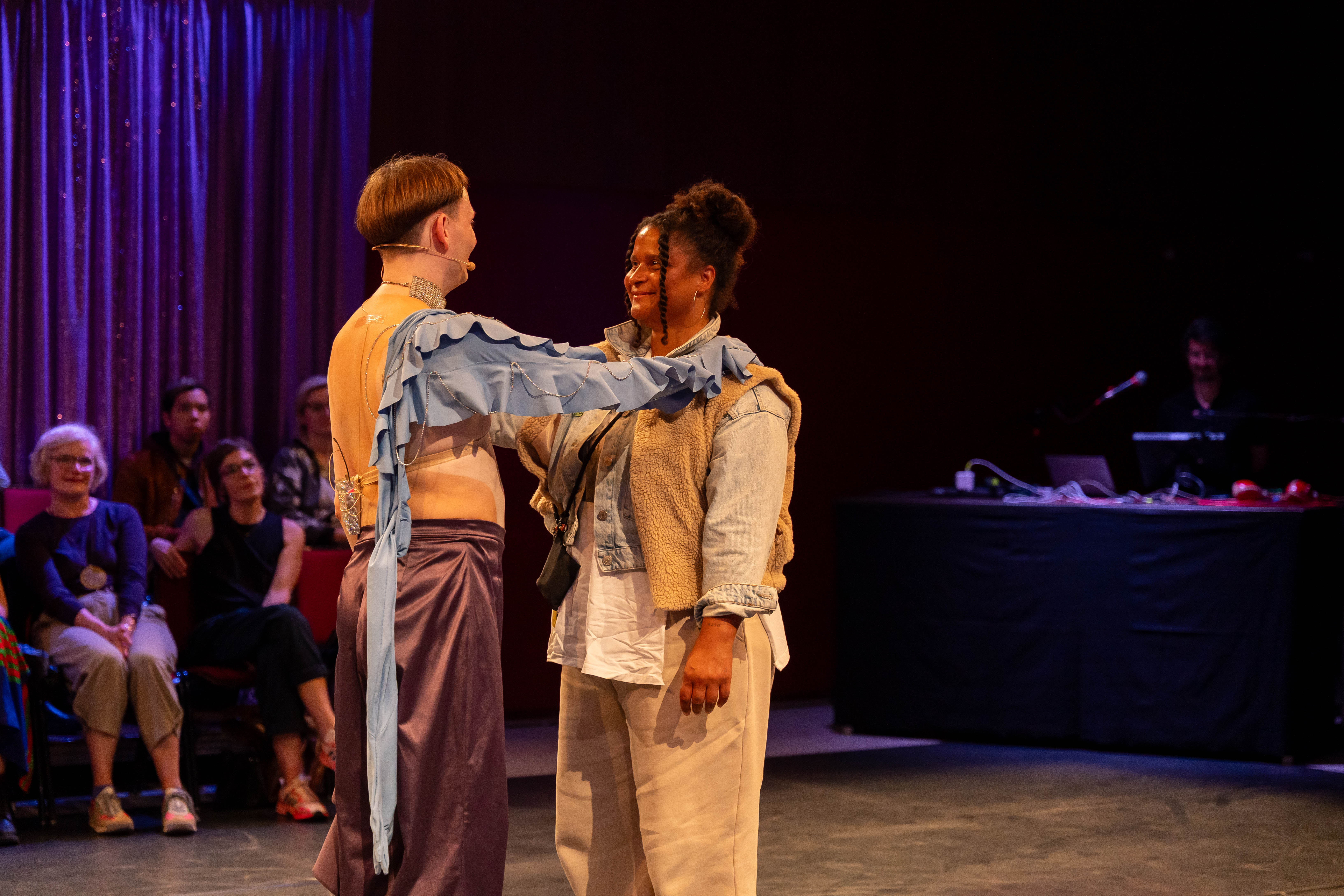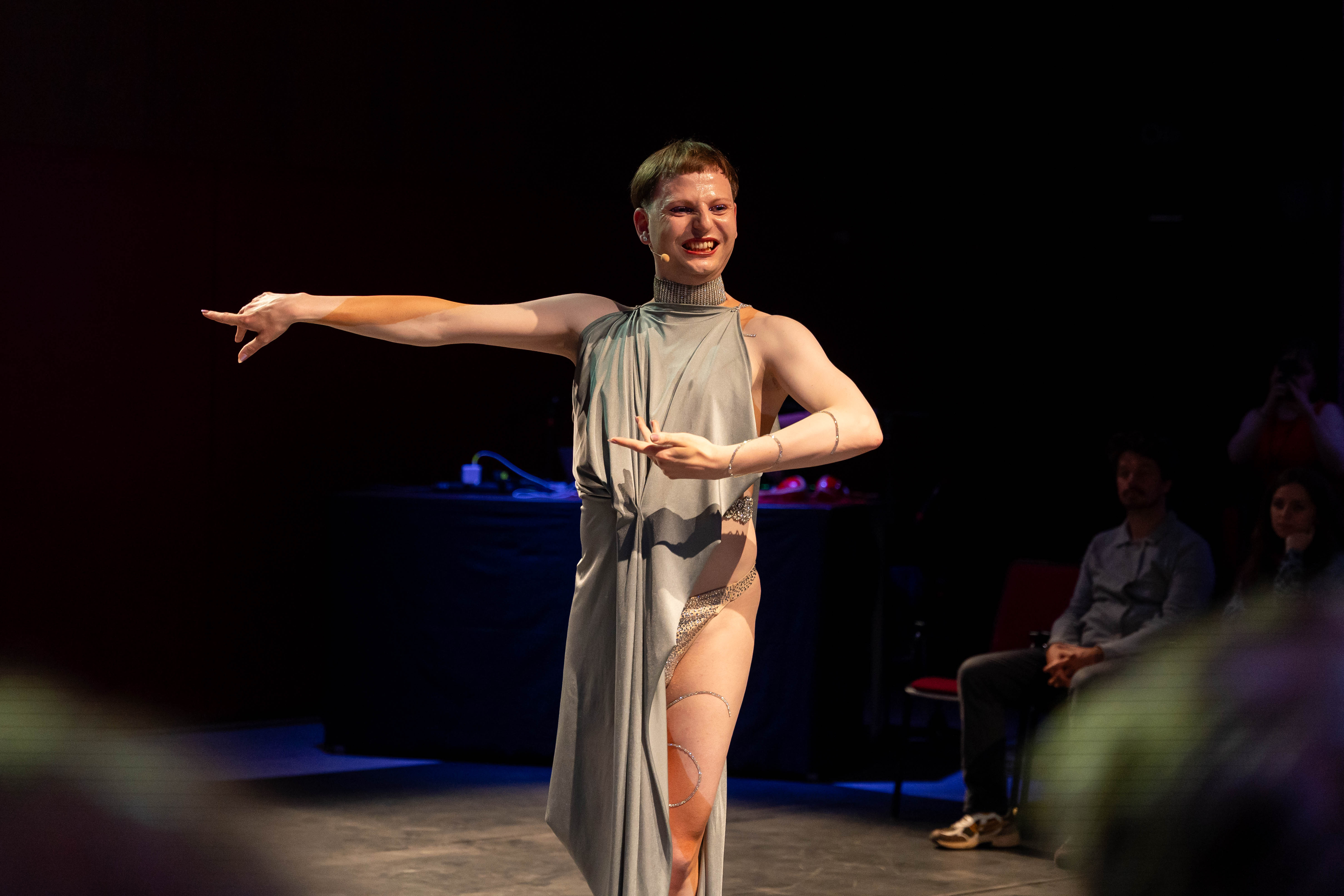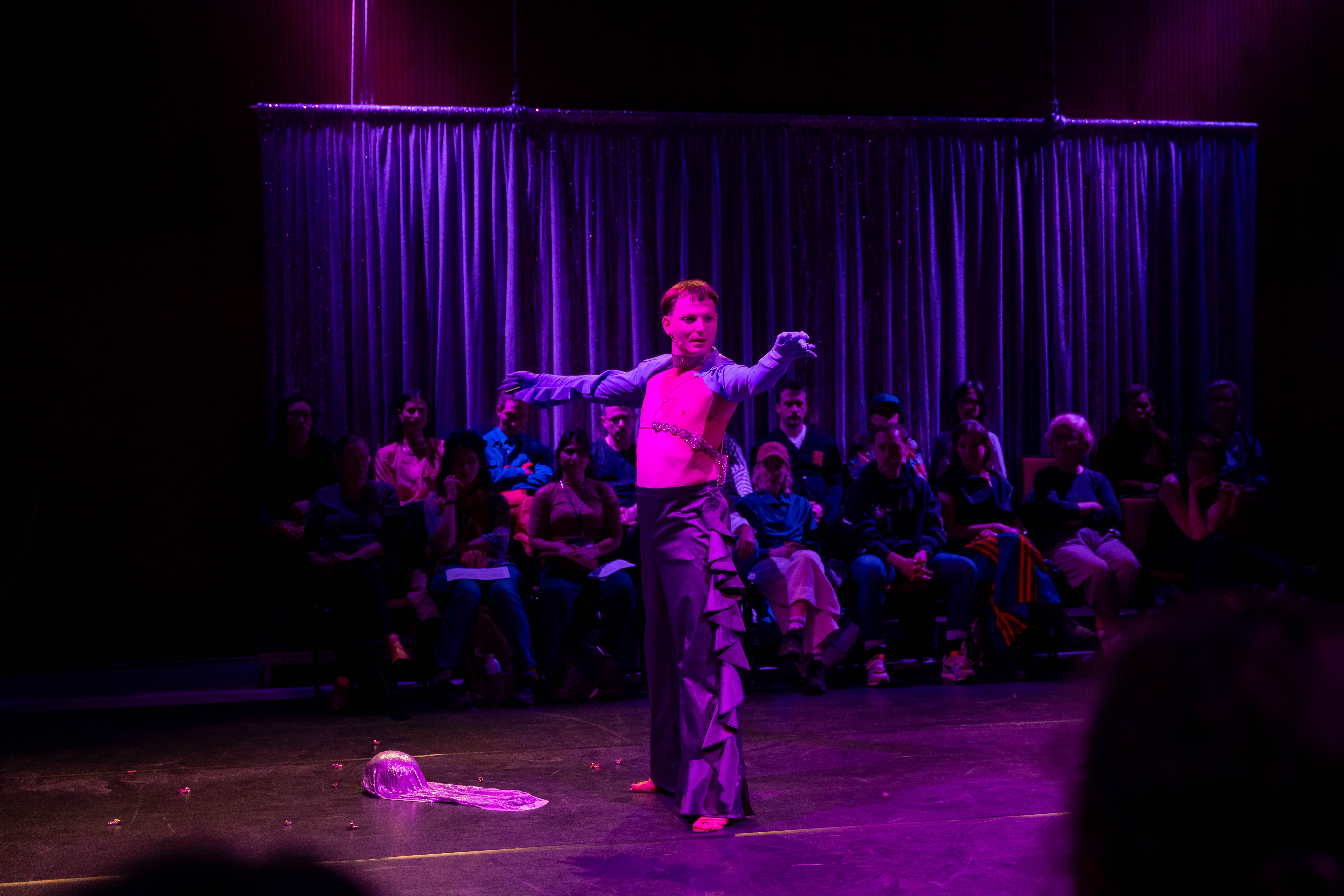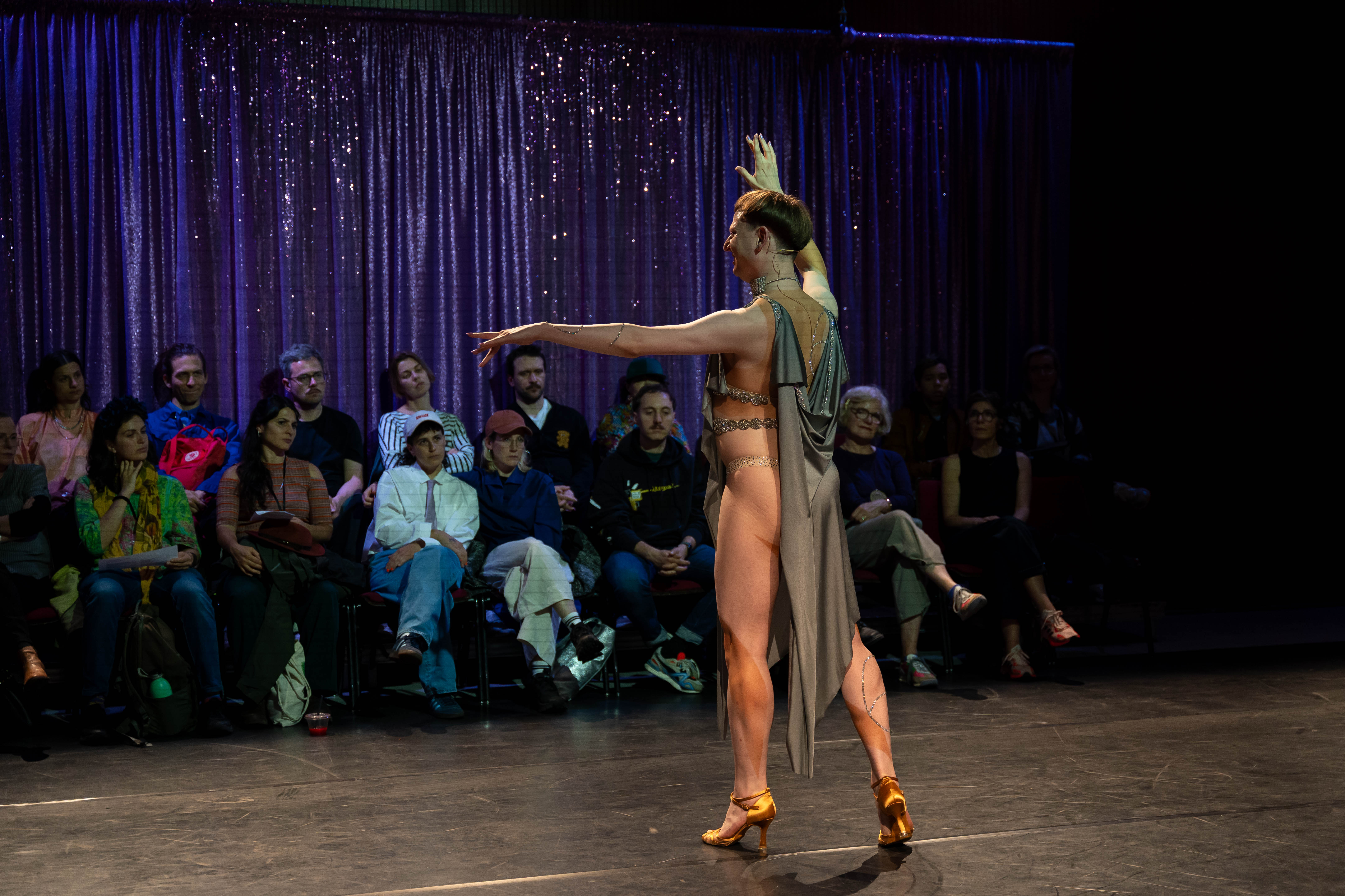 In FAKE DIAMONDS kehrt die Hamburger Choreografin und Tänzerin René*e auf die Tanzflächen ihrer Vergangenheit zurück, in Turnhallen, Gemeinderäume und Ballsäle. Sie tanzt mit und gegen sich als ehemaliger Tänzer im Leistungssport des lateinamerikanischen Turniertanzes. Auf der Theaterbühne erinnert sie sich an Berührungen mit Tanzpartner*innen, an strenge Blicke der Wertungsrichter*innen, an Schrittfolgen und an Bewertungskategorien. Sie denkt zurück an Strass-besetzte Kleider, an Selbstbräuner und exotisierende Musik, an Siegespokale und Niederlagen. Im funkelnden Schein falscher Diamanten choreografieren René*e und ihr Team jetzt die alten Tänze neu. In einer intimen queerfeministischen Tanzperformance, die ihr Gegenüber im Publikum sucht, befragen sie sexistische und rassistische Strukturen im Turniertanz, das heteronormative Ideal des romantischen Paares sowie binäre Vorstellungen von Gewinnen und Verlieren.