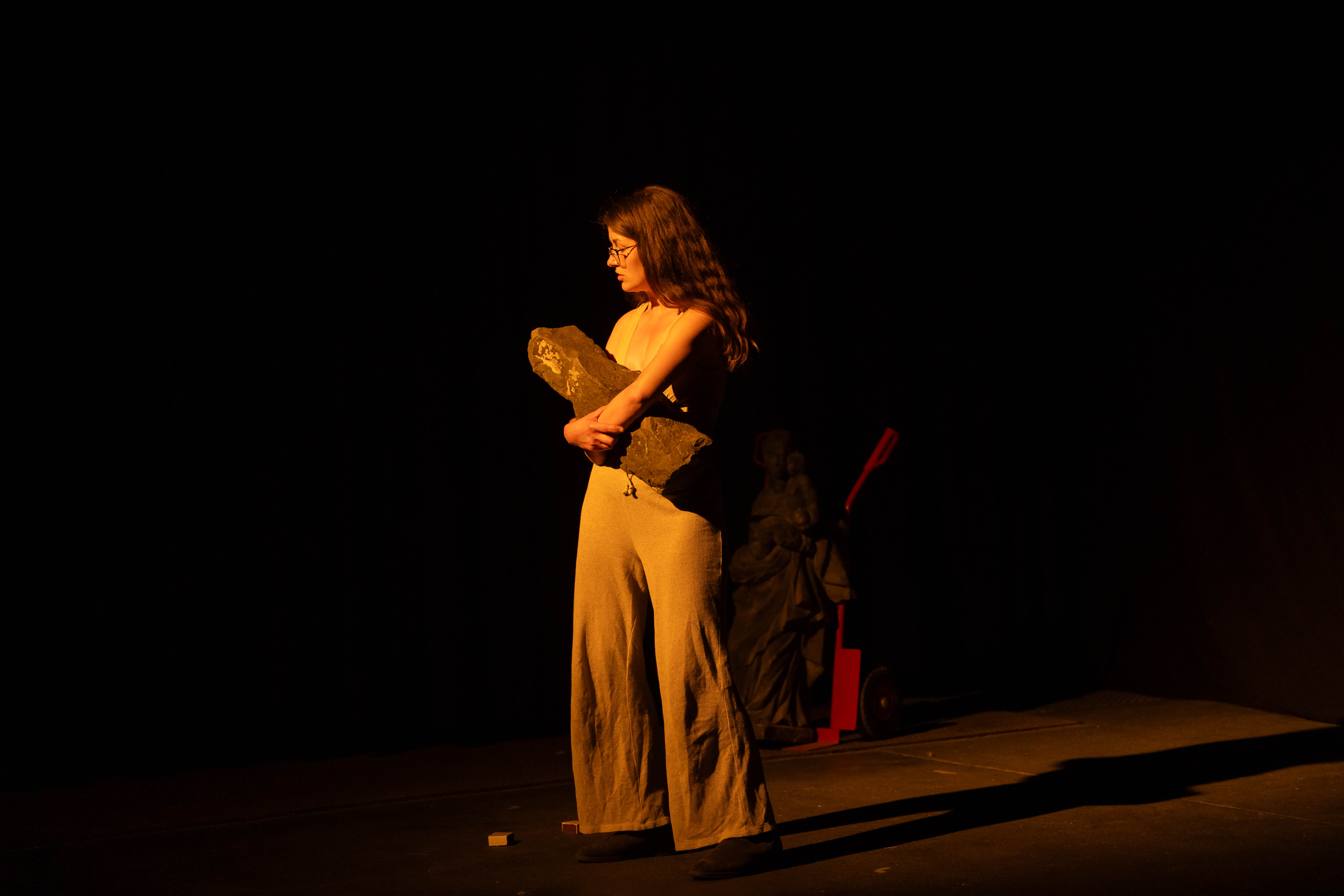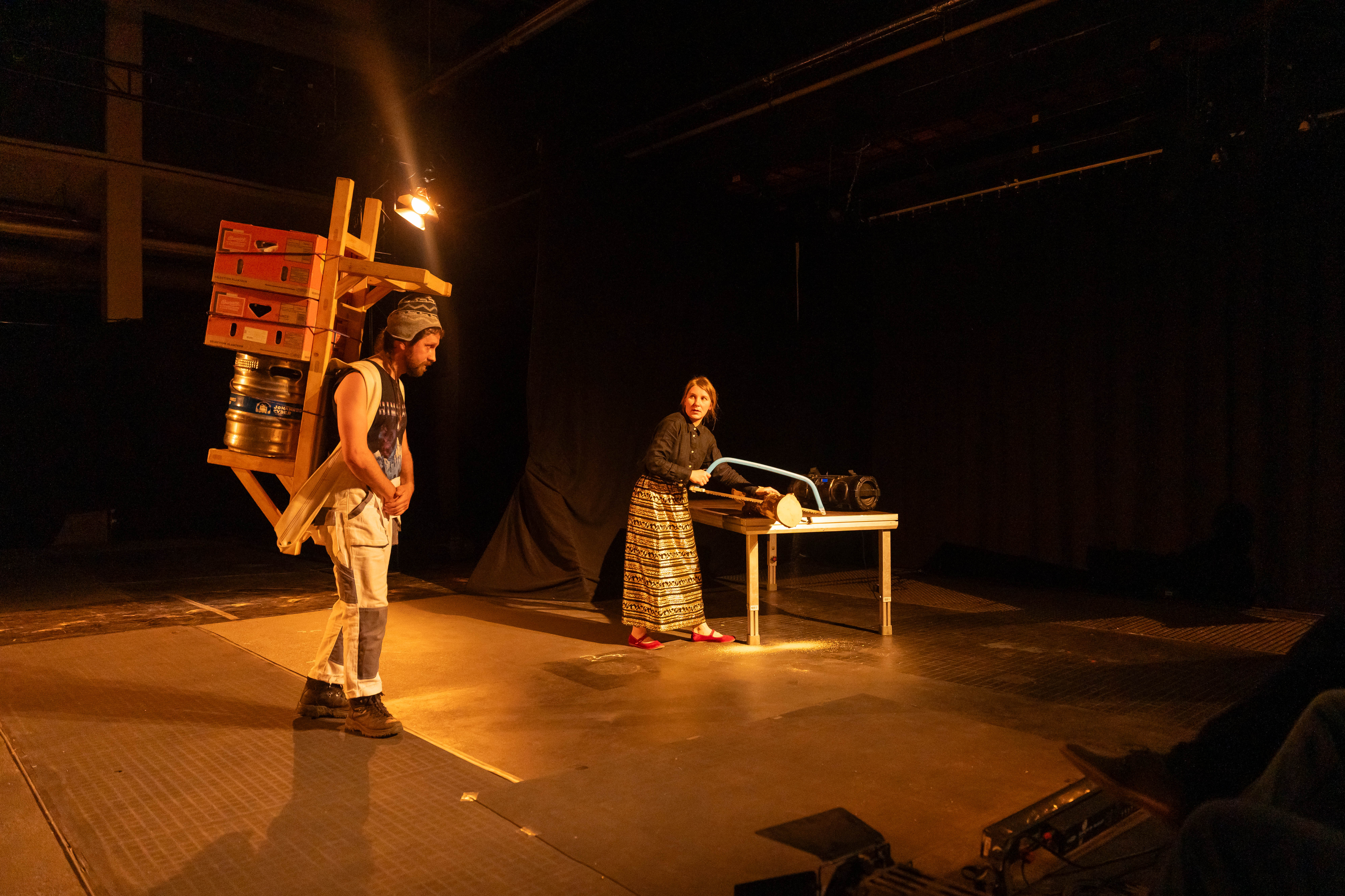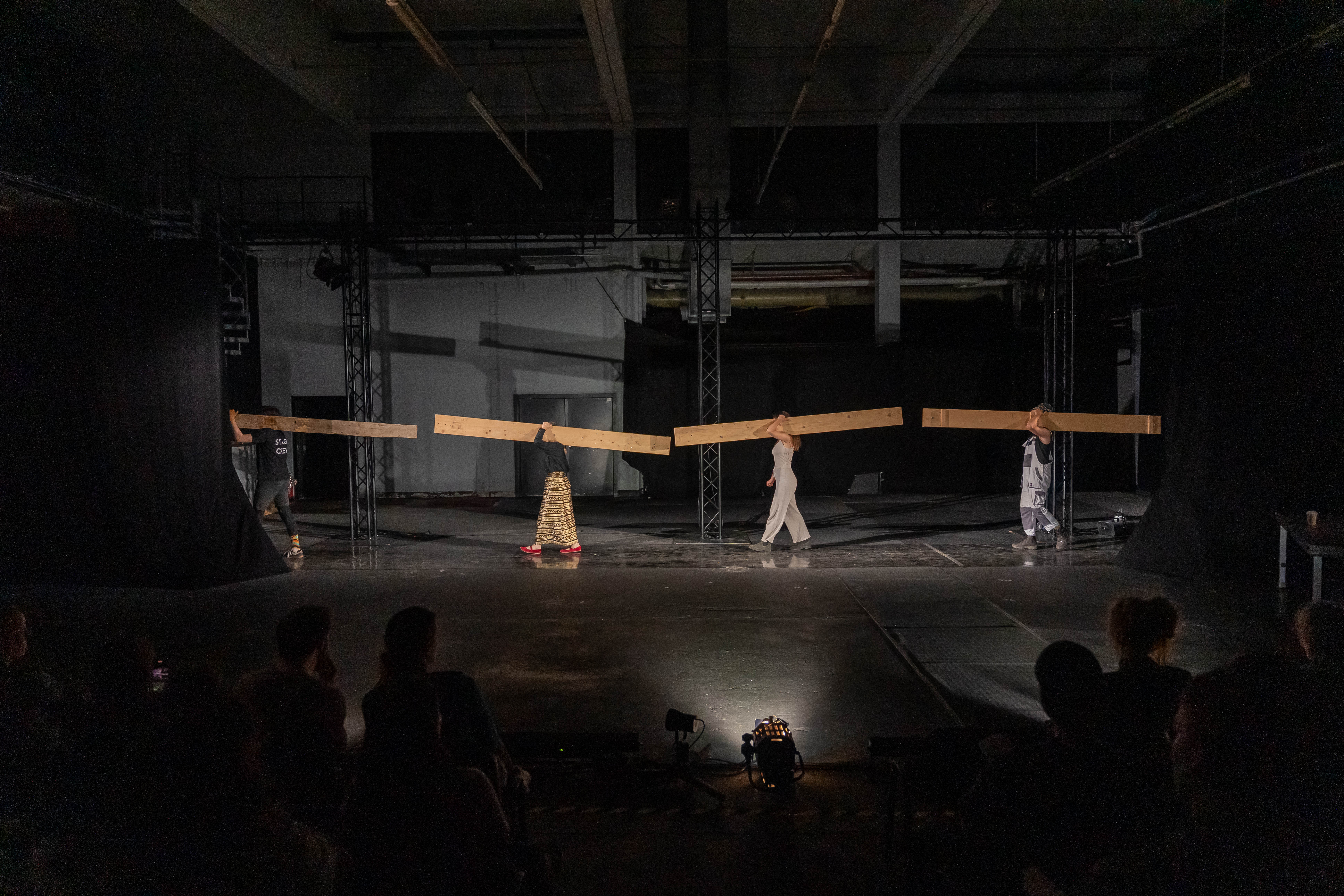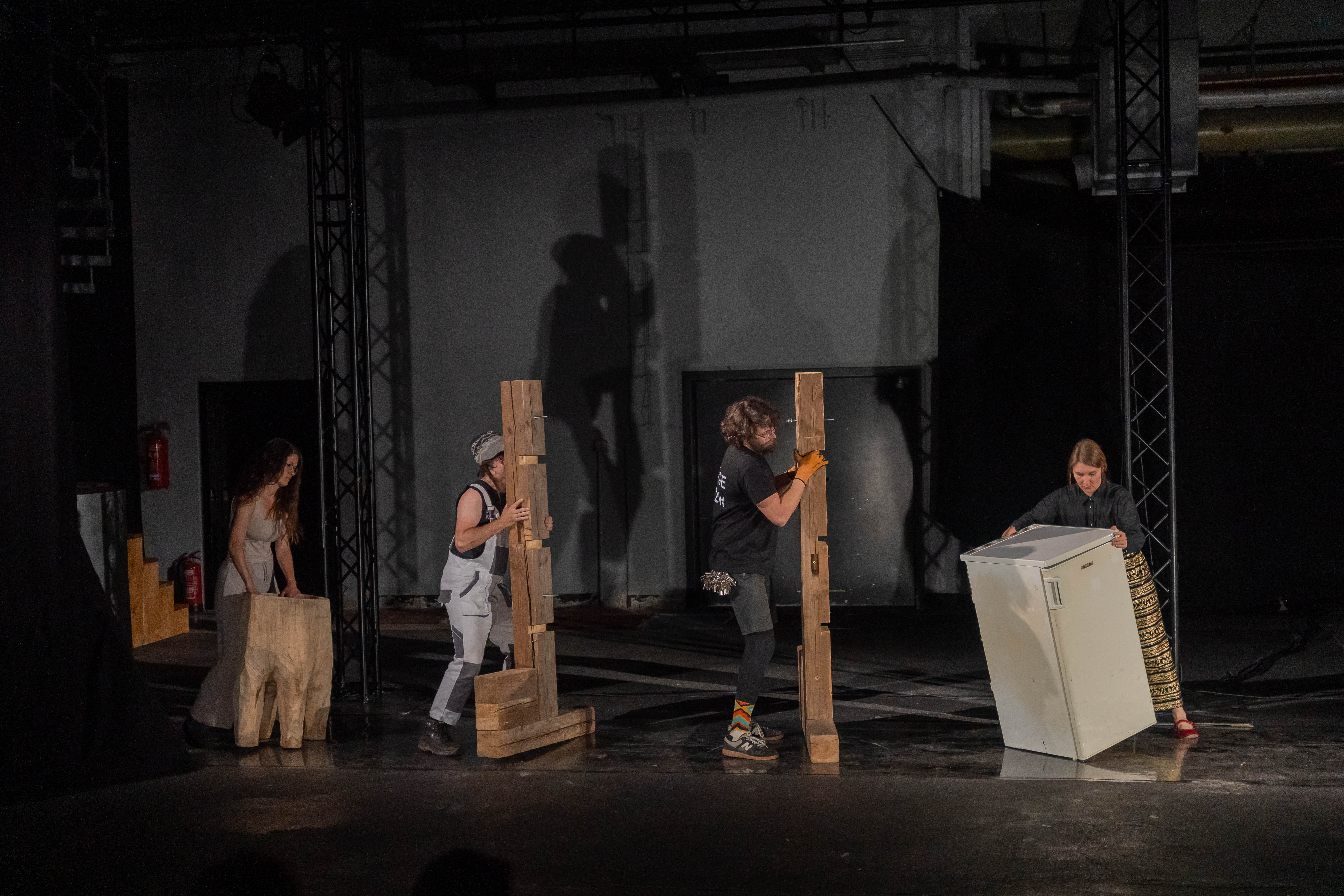 Wie viele Schritte muss ich machen, bevor ich absetze? Heavy Theatre ist ein Stück mit Schwerkraft – ein Theater der Lasten, der Anstrengungen, der Schönheit des Widerstands. Die Gruppe KHWOSHCH (Daria Gosteva, Frieda Gawenda, Vavřinec Němec und Tomáš Kočí) hat einen Hintergrund in Szenografie und modernem Puppentheater und Heavy Theatre ist ihre Erforschung des Gewichts als Haupteigenschaft des Objekts. Ein Gewicht, das nicht nur drückt, sondern auch formt: unsere Körper, unsere Rhythmen, die Art, wie wir uns bewegen, die Art, wie wir Zeit erleben. Schwere Gegenstände tanzen nicht – sie zwingen uns zum Tanzen, zur Verlangsamung. Jeder Schritt, jedes Heben wird zu einer Choreografie der Ausdauer. Die Bühne wird zu einem Ort des realen Geschehens, weit weg von der Illusion, nah am Körper. Es geht um das Tragen, das Loslassen, um Arbeit als Kunstform, um die Poesie des Körperlichen. Es geht darum, diejenigen sichtbar zu machen, die jeden Tag heben, bauen und bewegen. Heavy Theatre ist roh, wahrhaftig, ungewöhnlich – und lädt ein, sich von der Kraft der Materie berühren zu lassen.